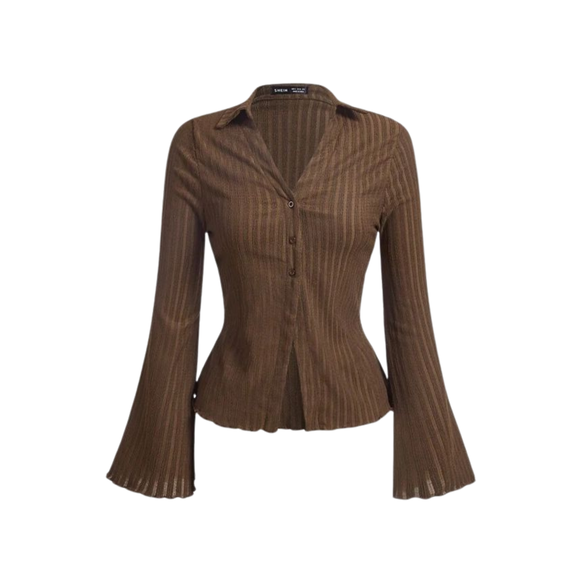 Channel early 2000s vibes with this mocha brown ribbed shirt. Featuring a fitted silhouette, textured fabric, and dramatic flared sleeves, this button-down top is the perfect mix of casual comfort and retro style.