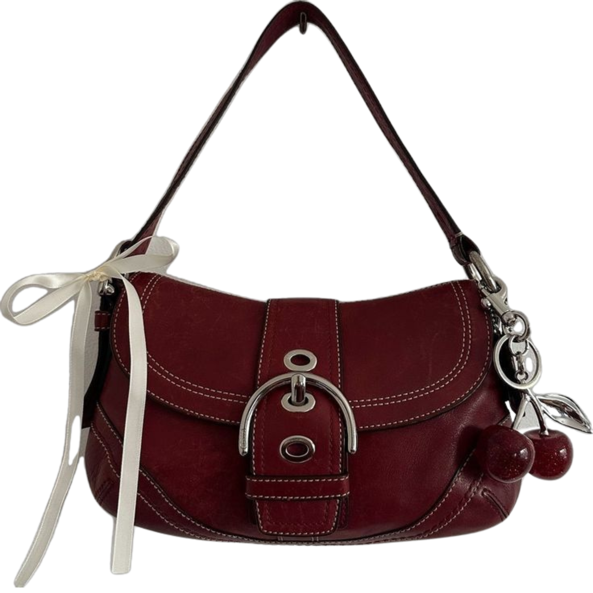 The ultimate Y2K statement piece. This burgundy shoulder bag features a bold silver buckle, contrast stitching, and is styled with a cute white satin ribbon and a sparkly cherry bag charm. The perfect mix of grunge and coquette aesthetics.