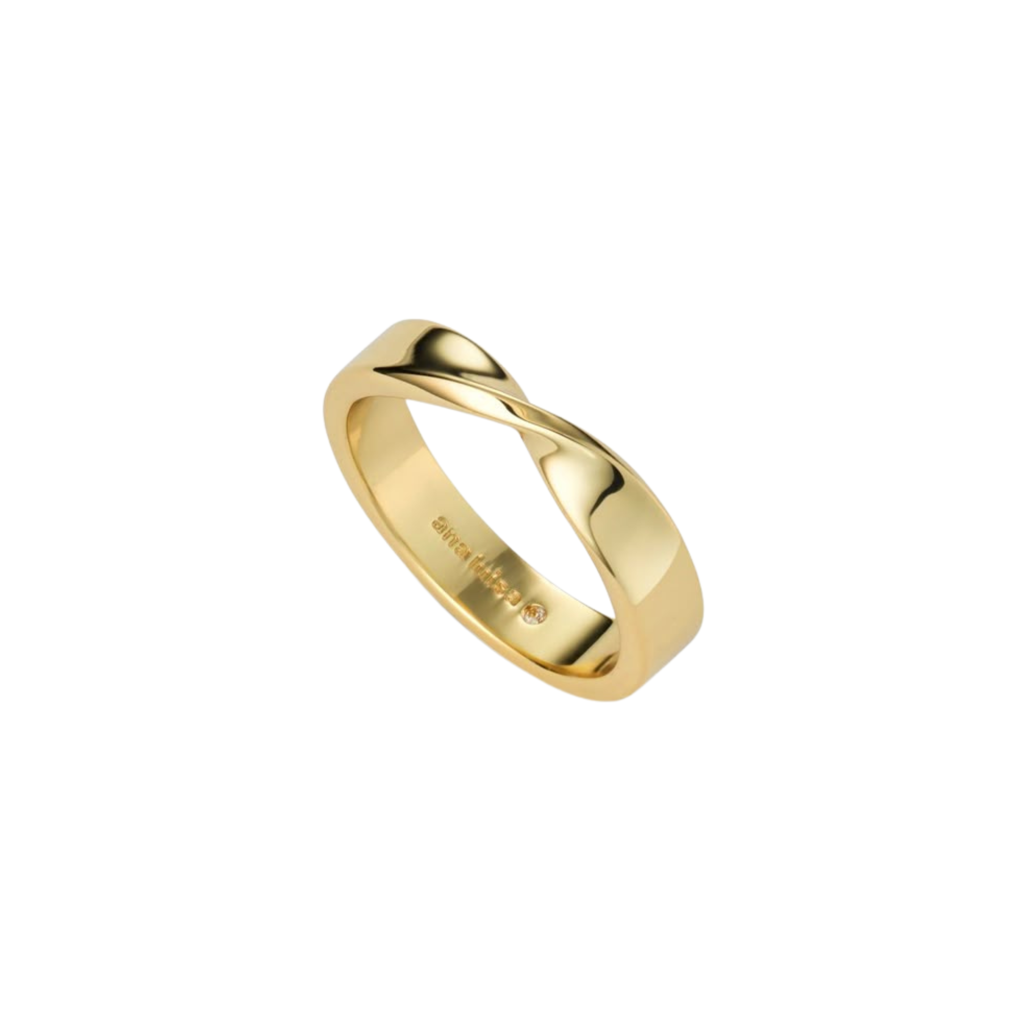 Simple, sleek, and timeless. This gold band features a sophisticated “twist” design (Mobius strip) that catches the light from every angle. A perfect everyday staple that looks stunning worn alone or stacked with other rings.