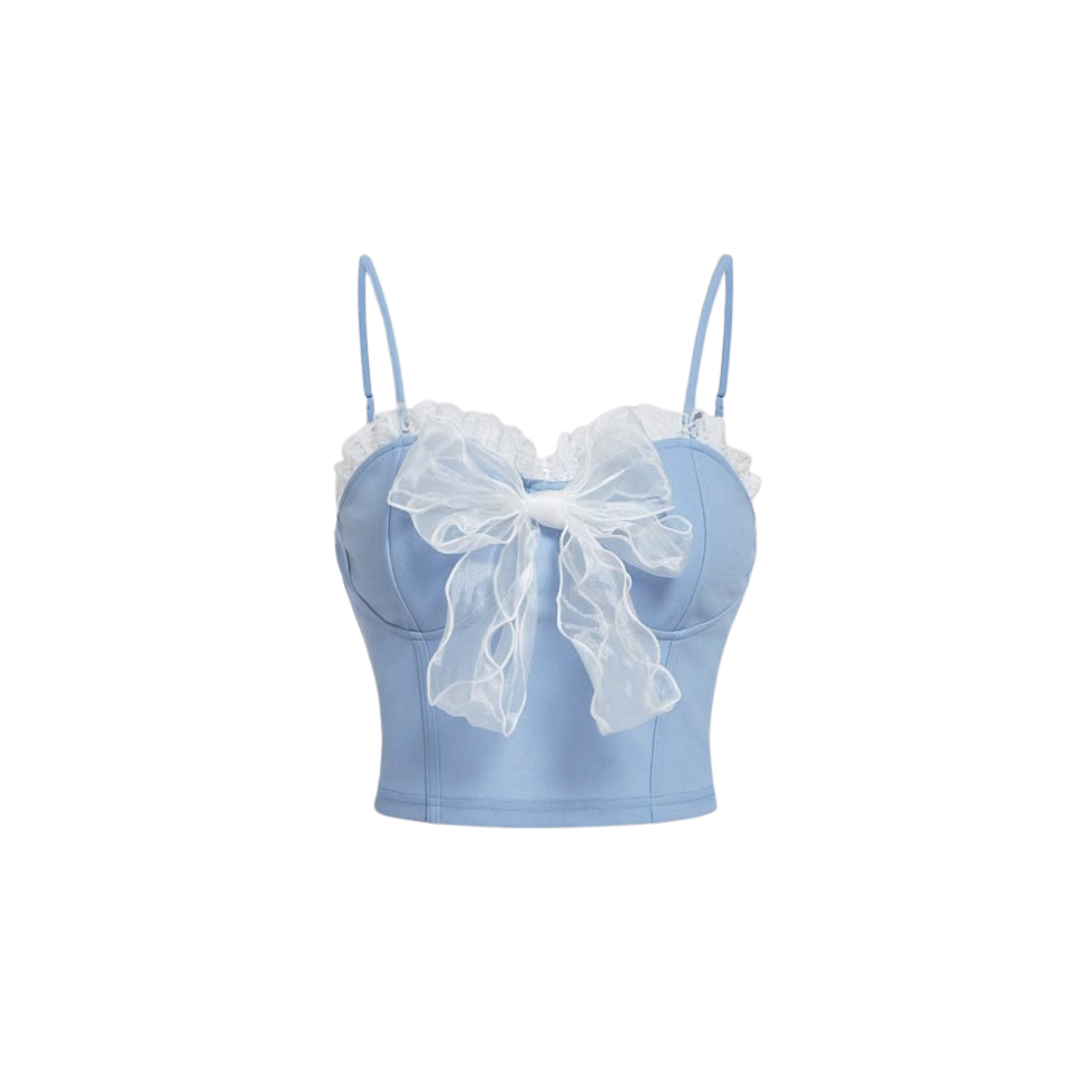 • Fit for a modern princess. This baby blue corset top is adorned with a massive, sheer organza bow on the front and delicate white lace trim.