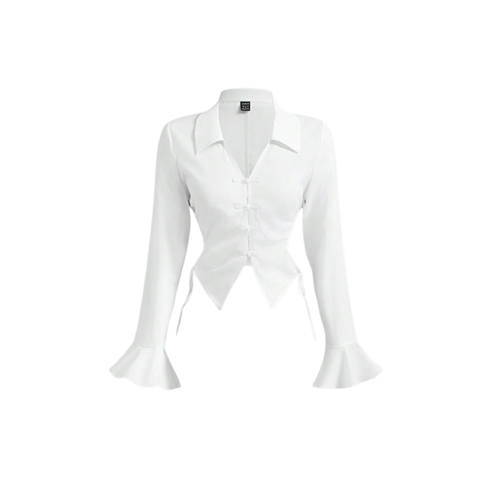 Reinvent your basics with this chic white blouse. Featuring distinctive Oriental-style frog button closures, romantic flared cuffs, and a flattering pointed hemline, this fitted shirt adds a unique, feminine twist to the classic button-down.